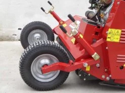 L’altezza di taglio è regolabile tramite appositi menettini che alzano e abbassano le ruote e di conseguenza il rullo di taglio.