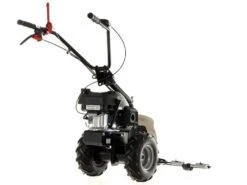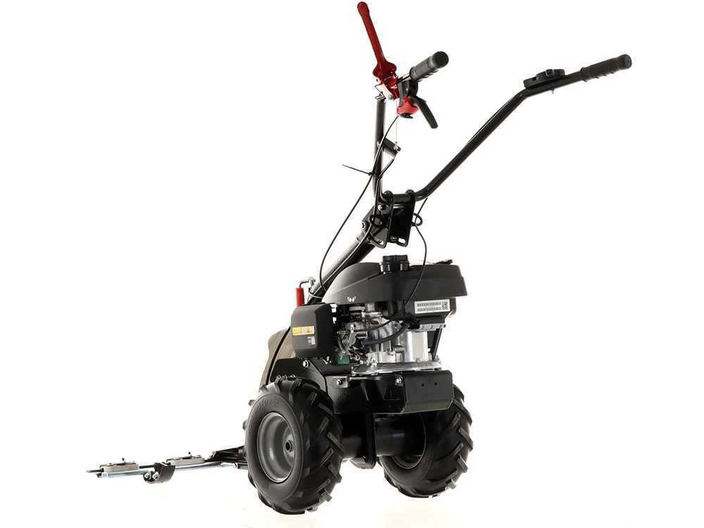 Motofalciatrice a scoppio dotata di trazione (semovenza) sulle ruote scolpite pneumatiche.