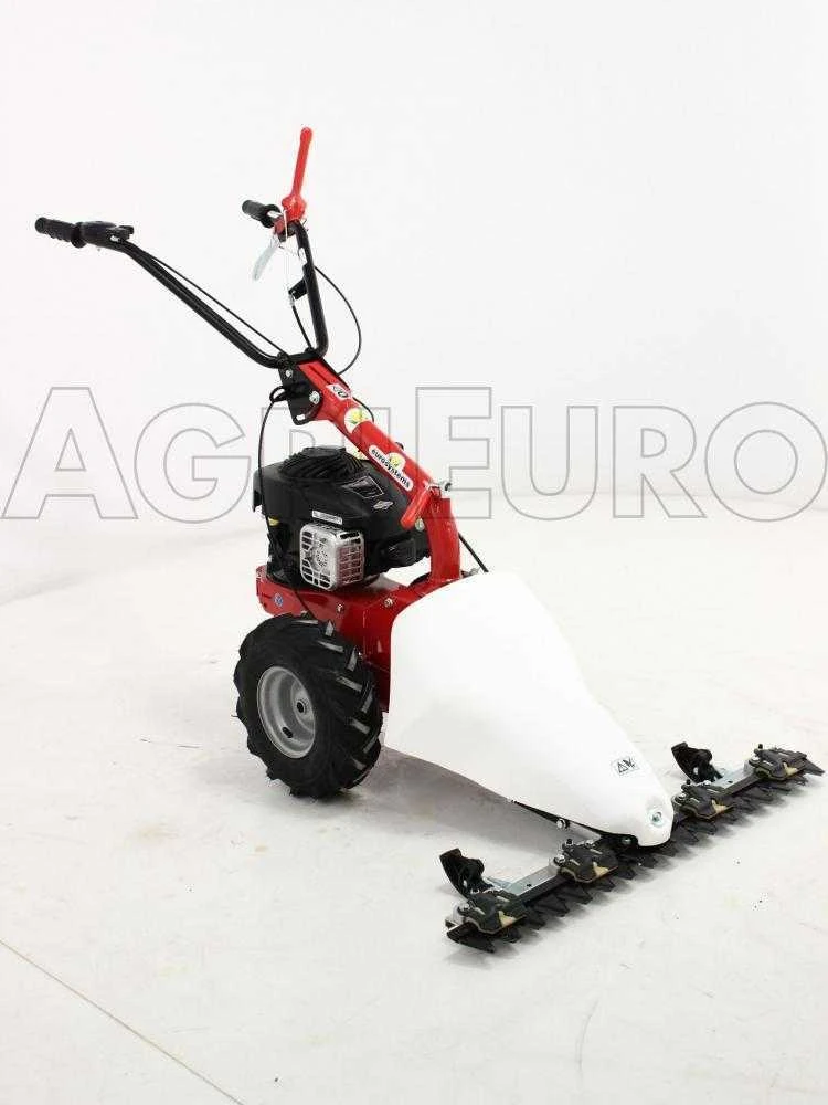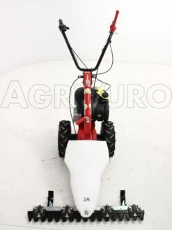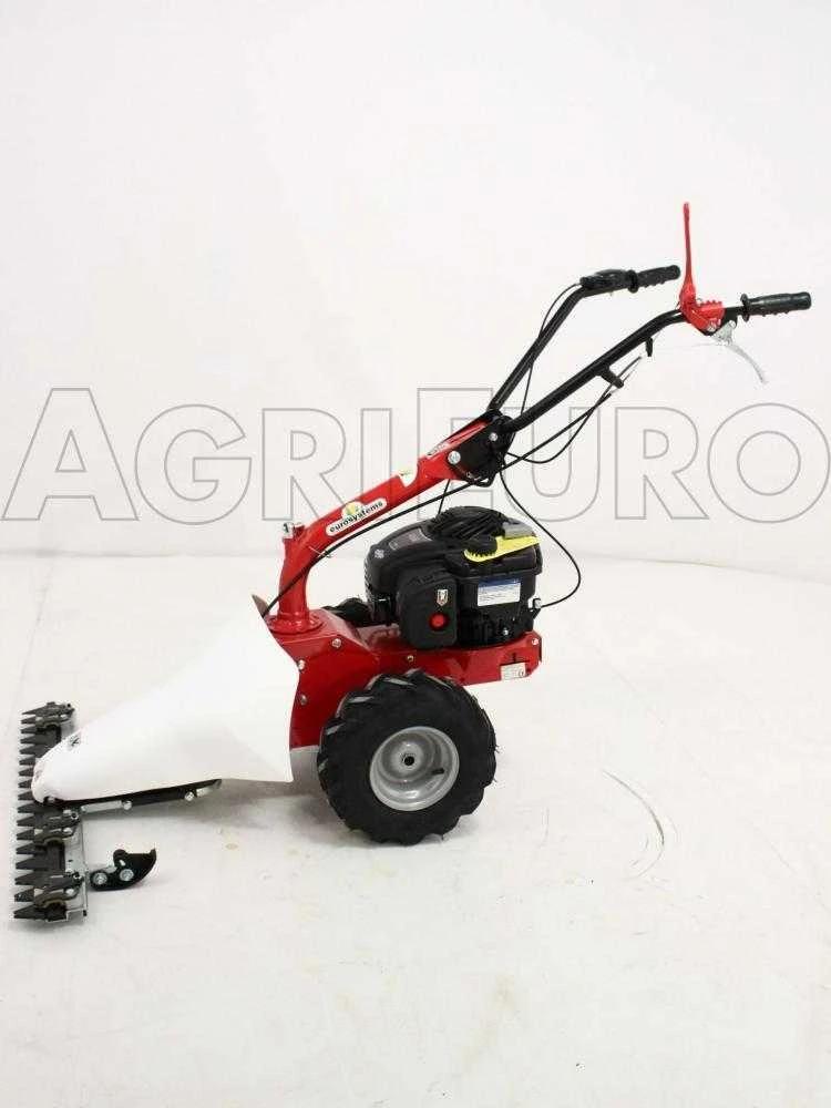 Motofalciatrice Eurosystems con taglio bilama, dotata di ruote pneumatiche scolpite trazionate, collegate ad una trasmissione a vite senza fine in bagno, dotata di unica marcia avanti. L’accessorio fornito di serie, è del tipo (sia la lama inferiore che quella superiore di cui è composta la barra si muovono ed in moto contrapposto).
