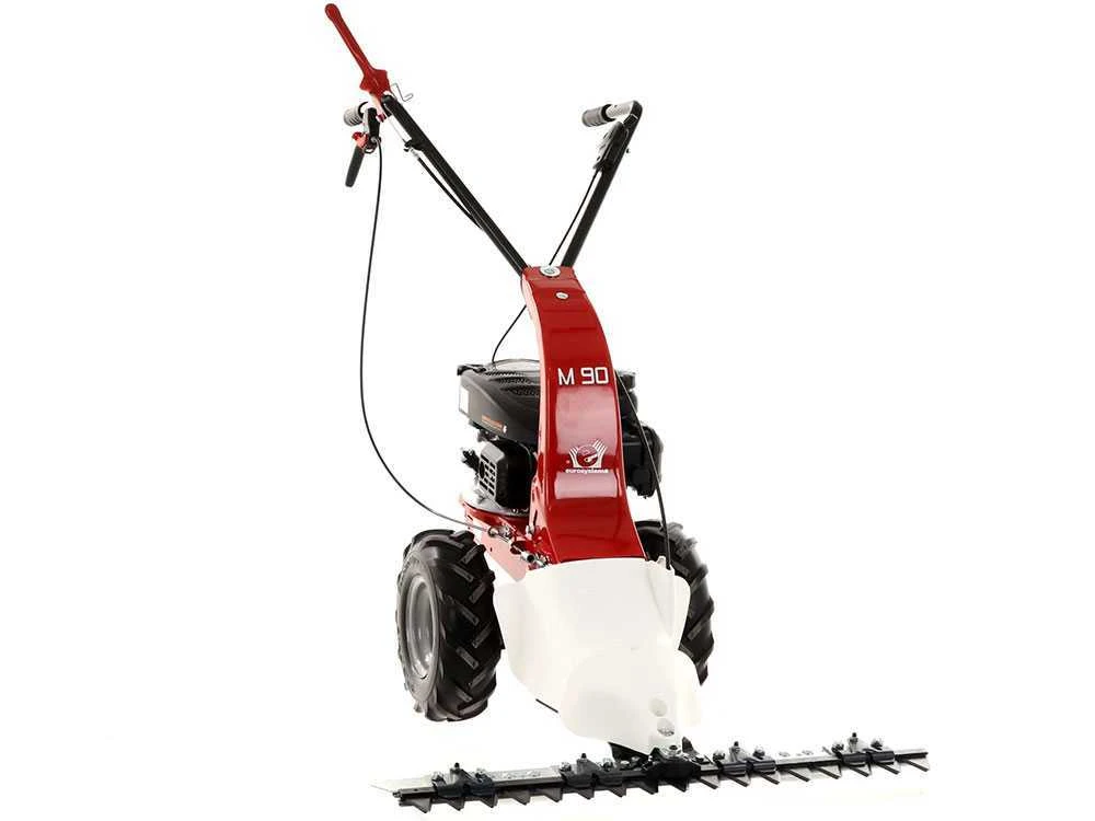 La M90 è una falciatrice con motore a scoppio a benzina trazionata dotata di ruote pneumatiche scolpite comandate da una trasmissione a vite senza fine in bagno d’olio. La (compresa di serie nel prezzo d’inserzione) è del tipo mulching con m.