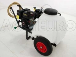 Carrello con 2 ruote pneumatiche di grandi dimensioni. Cisterna da 120 lt in polietilene con filtro di aspirazione esterna.
