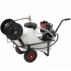 Carrello con 2 ruote pneumatiche di grandi dimensioni . Cisterna da 55lt in polietilene con filtro di aspirazione esterna.