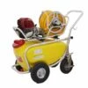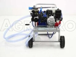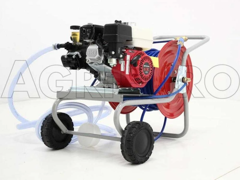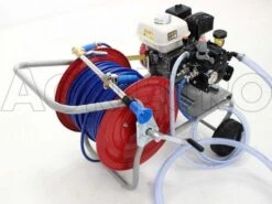La scelta di questa motopompa montata su carrello è dettata dall’esigenza di non trascinarsi dietro una pesante motocarriola con il liquido dentro, ma lasciare tutta la carriola nel punto iniziale mettendo i tubi a pesca in una cisterna nelle immediate vicinanze e impugnando esclusivamente la lancia irroratrice allontanarsi e raggiungere tutti i punti che uno vuole trattare senza trascinarsi dietro apparecchiature. L’avvolgitubo può tenere fino a 200mt di tubo. Ulteriore tubo può essere trovato tra i prodotti correlati.