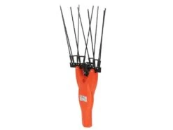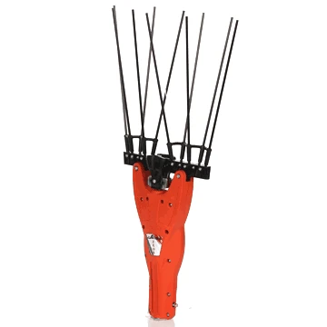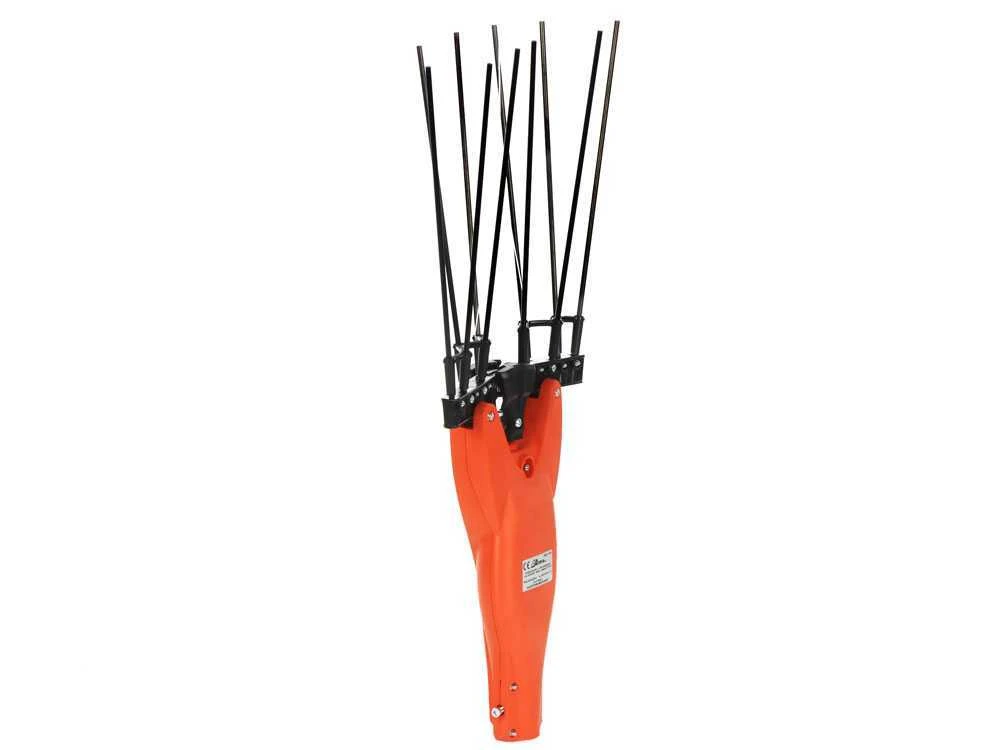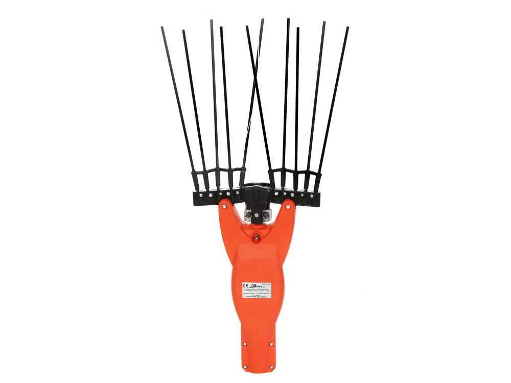 Il pettine di raccolta è fornito di 5+5 aste in carbonio e kevlar disposte ad ala di gabbiano, particolarmente indicato per drupe tenaci.
